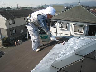 屋根に下塗り(スラリー強化プライマー)を塗っている島村リーダー。