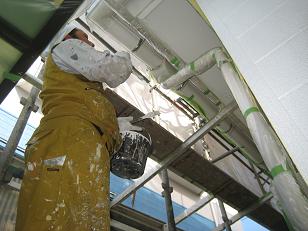 雨樋を塗っている春本リーダー。