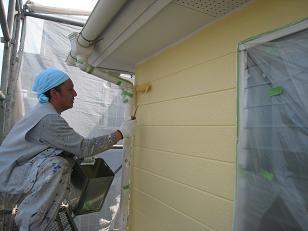 筑紫野市 Oさま邸、6日目。 今日は、春本リーダーと今井さんで、軒天の中塗りと外壁の試し塗りで色合せをしました。 ハケで軒天の中塗りをしている今井さん。 外壁の試し塗りの色を塗っている春本リーダー。 試し塗りの結果、最初に塗った黄色っぽい色から、やや肌色っぽい色に決定しました。 明日は現場はお休みです。